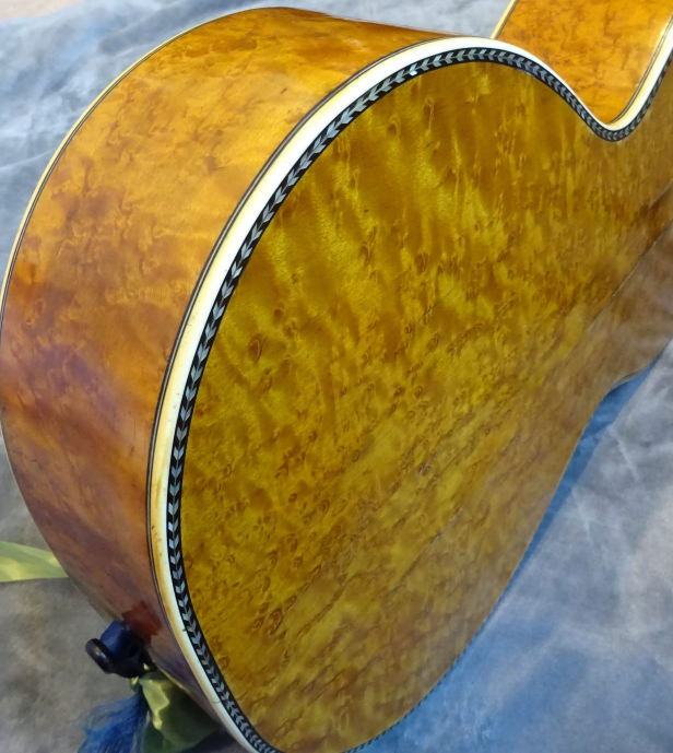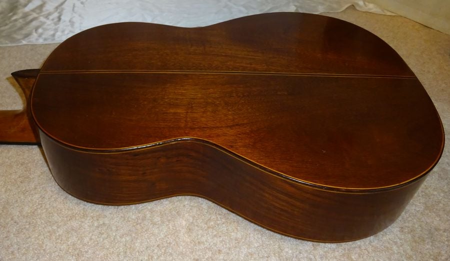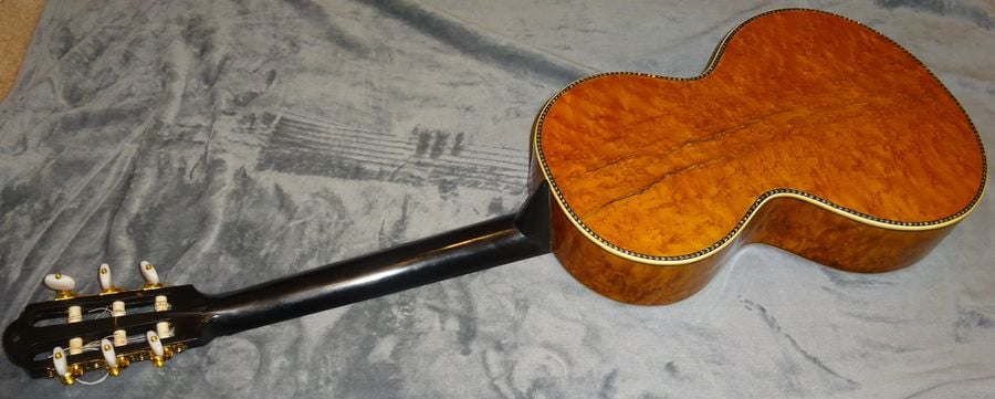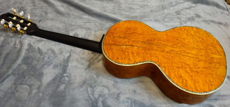 スプルースの表面板、マホガニーの裏板、ハカランダの横板。