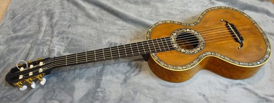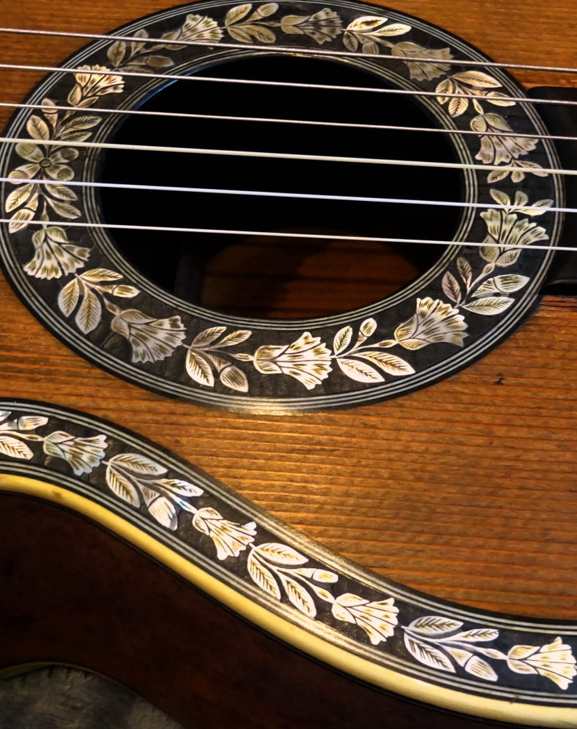 鼈甲と真珠貝で装飾された最高級モデルです。ムスターシュと指板も鼈甲。